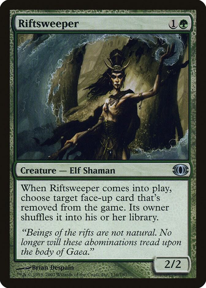 When Riftsweeper comes into play, choose target face-up card that’s removed from the game. Its owner shuffles it into his or her library.